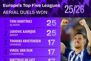 体育资讯9月12日讯 Squawka统计了本赛季球员在五大联赛的争顶成功次数,并列出榜单。